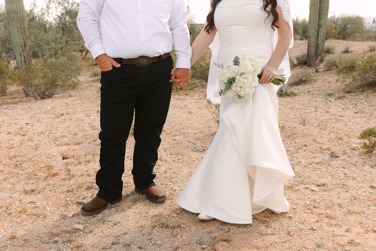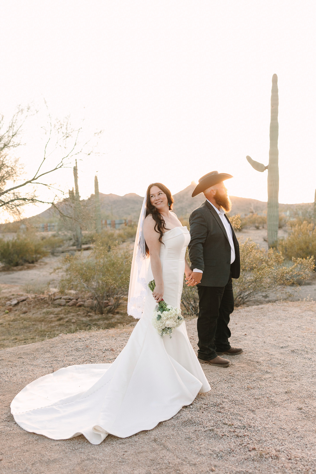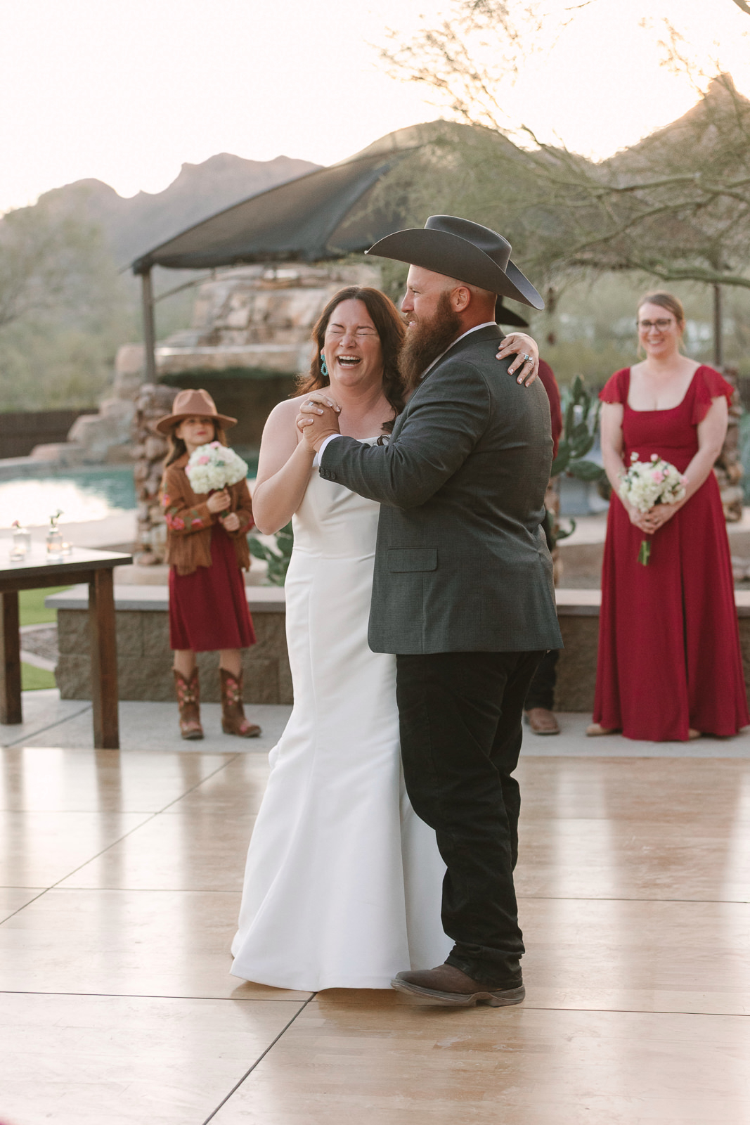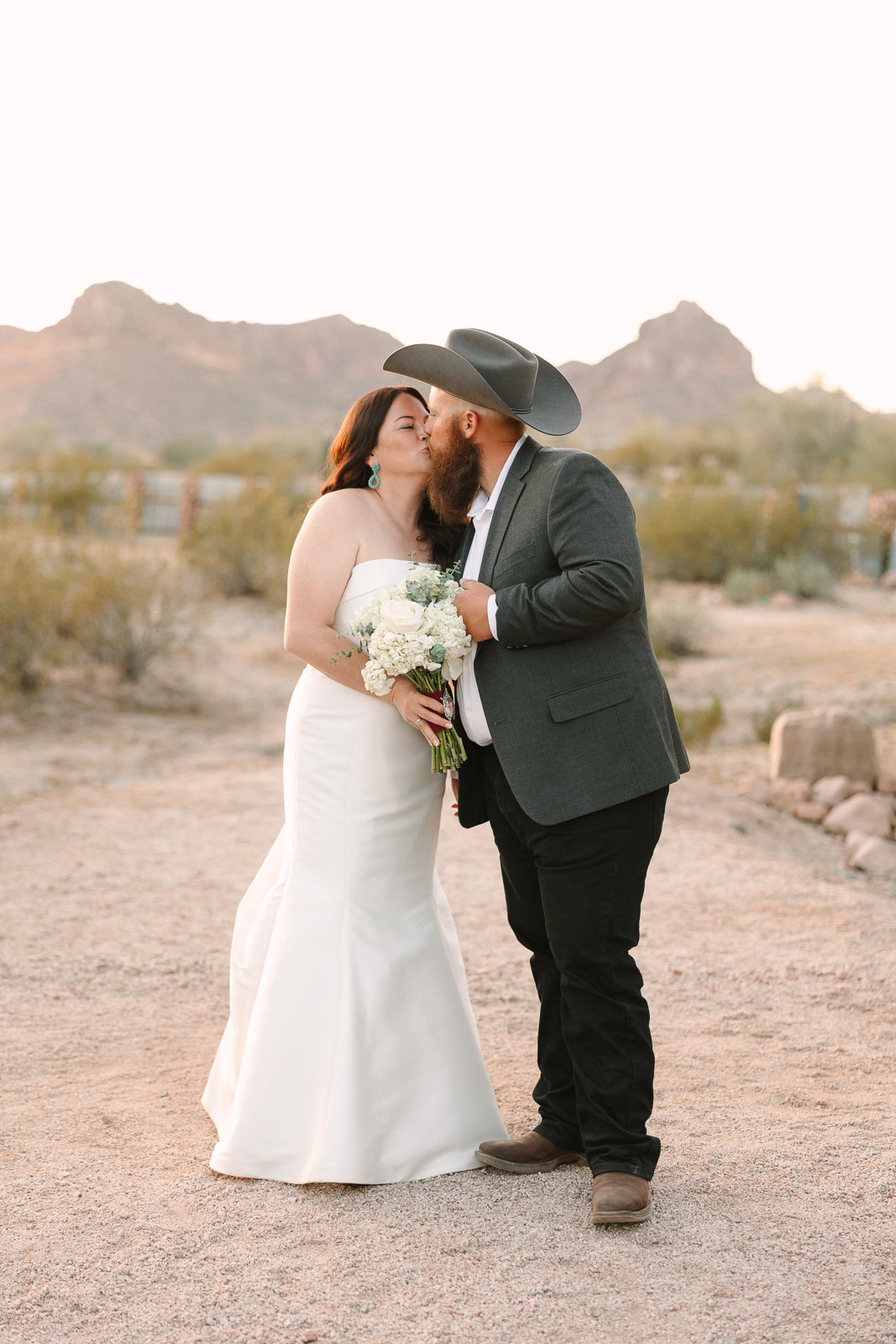 The vibe was 90s western romance meets desert elegance. Cowboy touches layered with softness. Golden light spilling across the landscape. A private estate tucked into the Arizona desert that felt intimate and personal. It was effortlessly cool and deeply sentimental all at once — the perfect balance of classic love story and cowboy charm.